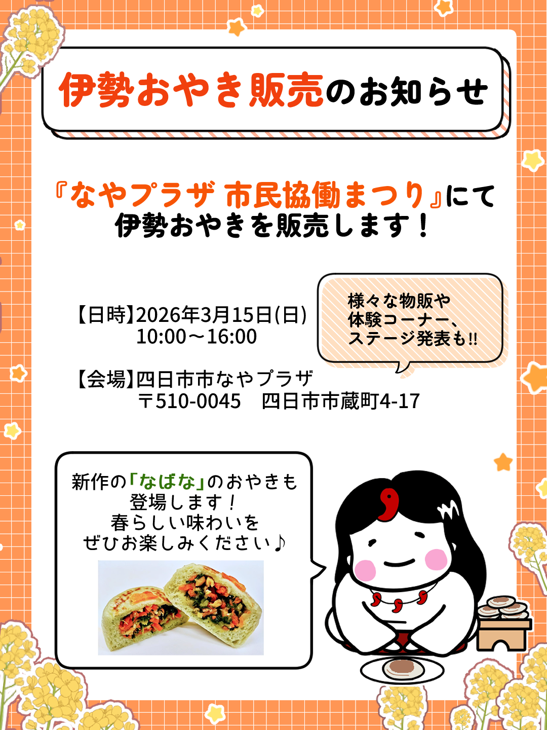 3月15日(日)になやプラザにて開催される「市民協働まつり」にて、伊勢おやきを販売します!
