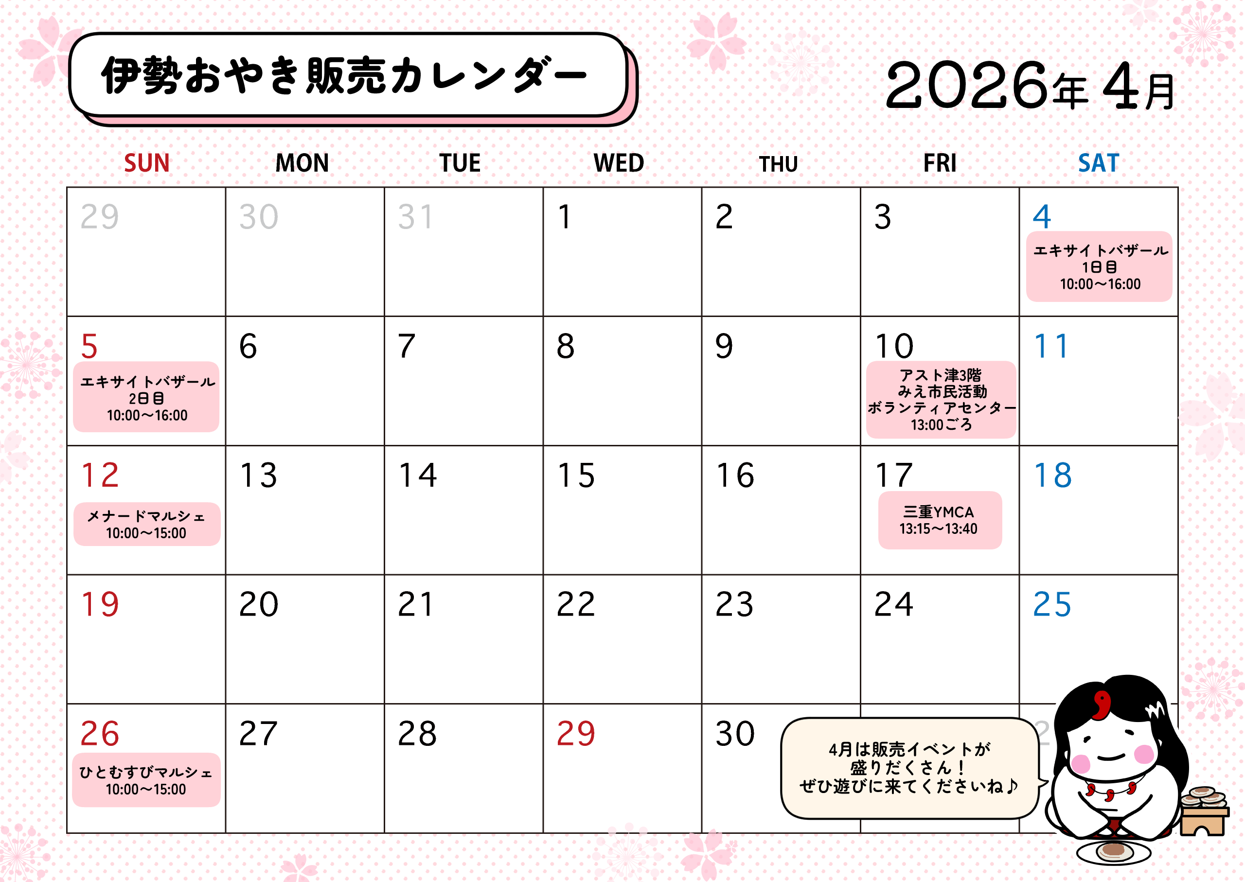 今回は行けなかった…という方も、4月は伊勢おやき本舗販売イベントが盛りだくさんです!!