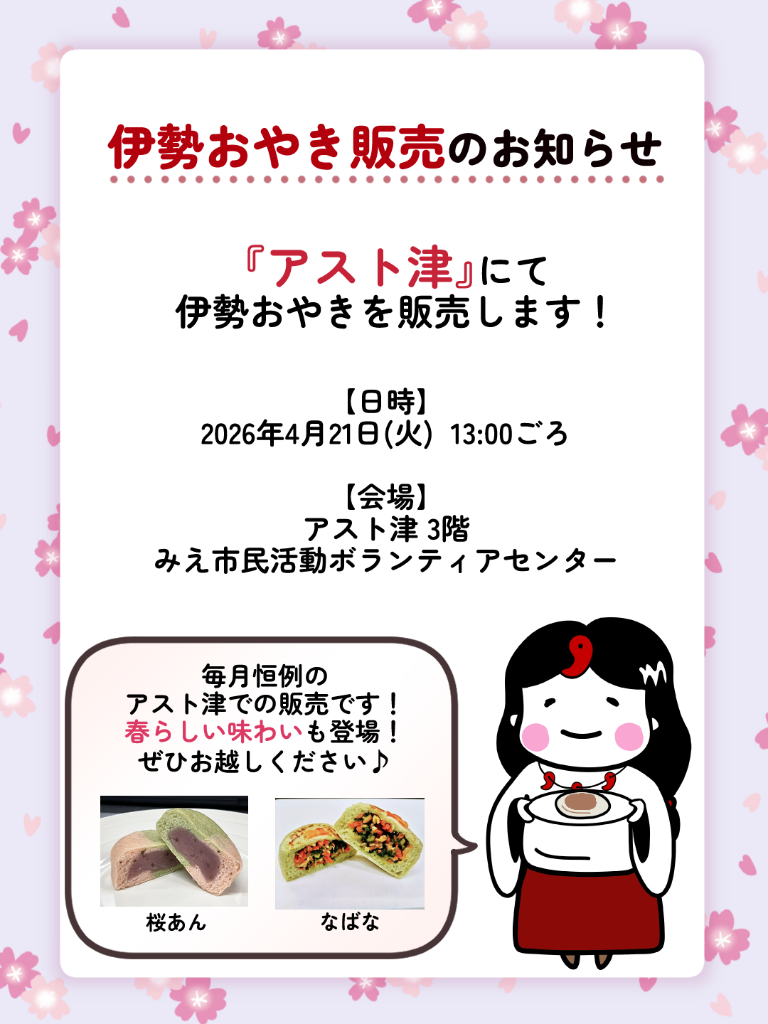 おやき販売のお知らせ2026年4月21日(火)、アスト津にて13時頃から伊勢おやきを販売します!
